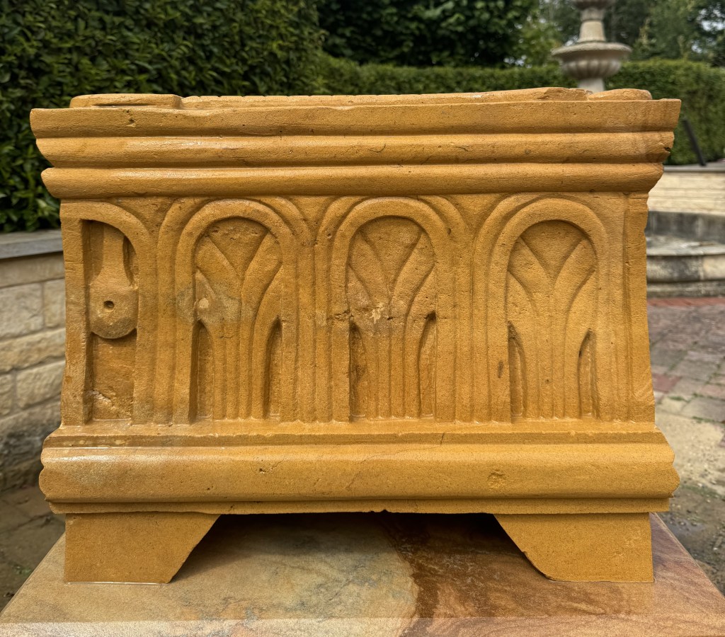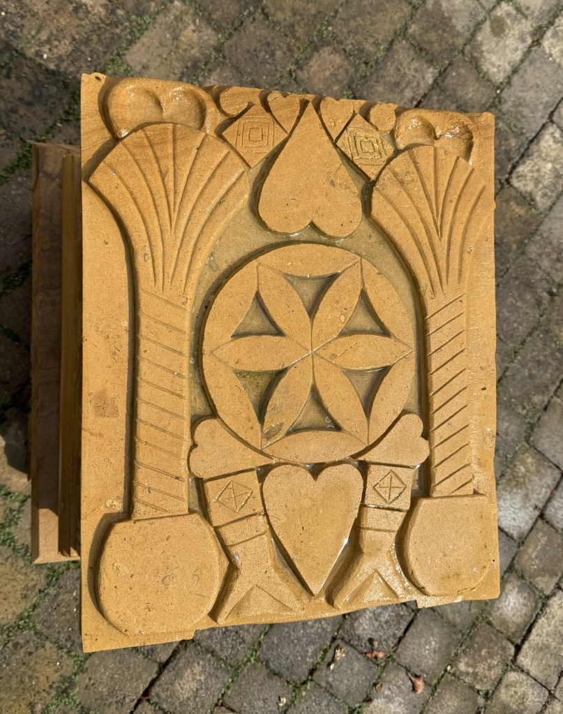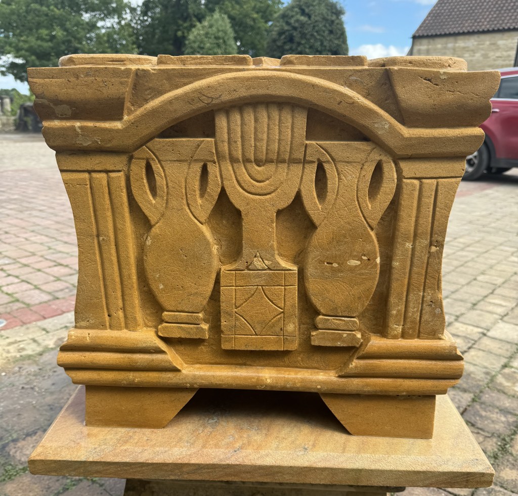 The top face shows two Palmate Columns, with opened shewbread in heart displays and possibly fishes design; small tables with square and diamond motifs; the central rose feature is believed to represent flowers embroidered in the veil of the Temple or possibly shewbread arranged in a circle representing the Twelve Tribes of Israel.
